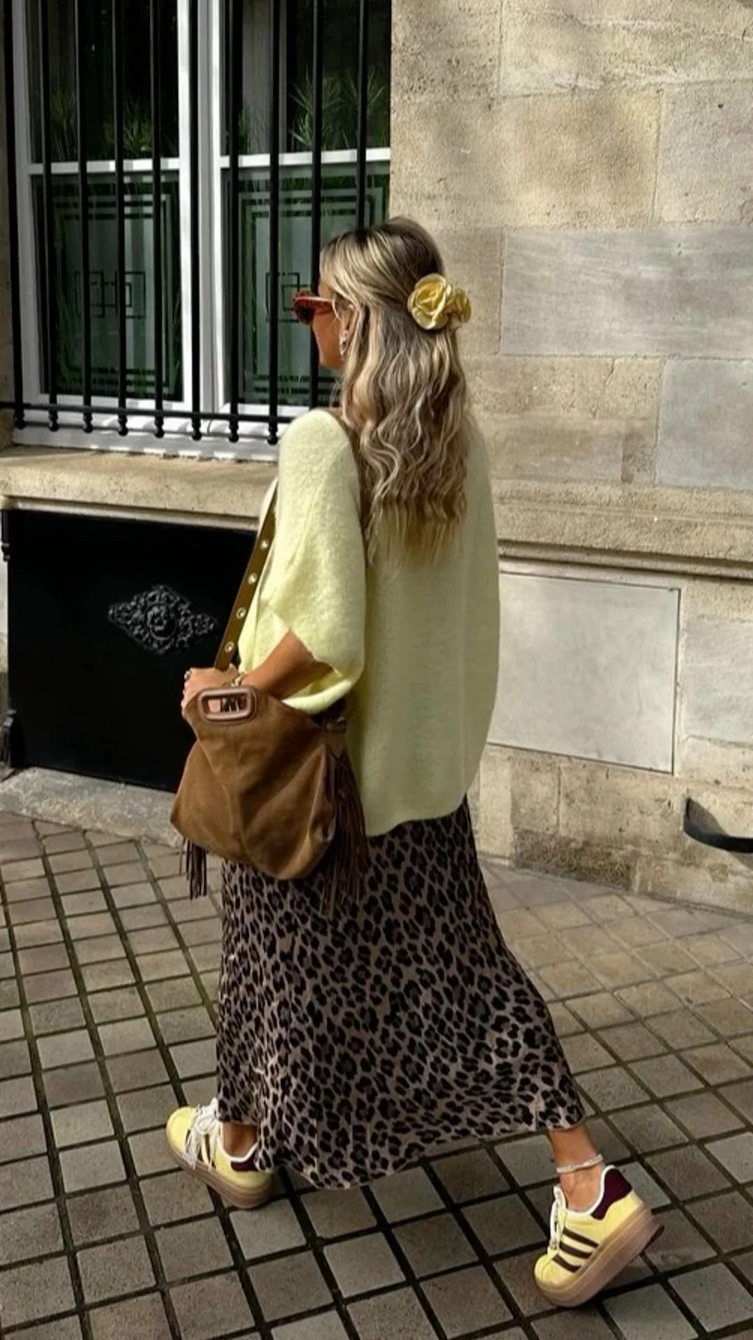 Accessories: A crossbody bag and a pair of vintage earrings complete the ensemble.